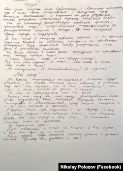 Advokat Nikolay Polozov Aqmescitte yaqalanğan qırımtata rfaali Nariman Celâlnıñ metübini yayınladı. Mektüpte Celâl böyle olacağına azır olğanını yazdı ve halqnı keri çekilmemege ve toqtamamağa çağırdı.